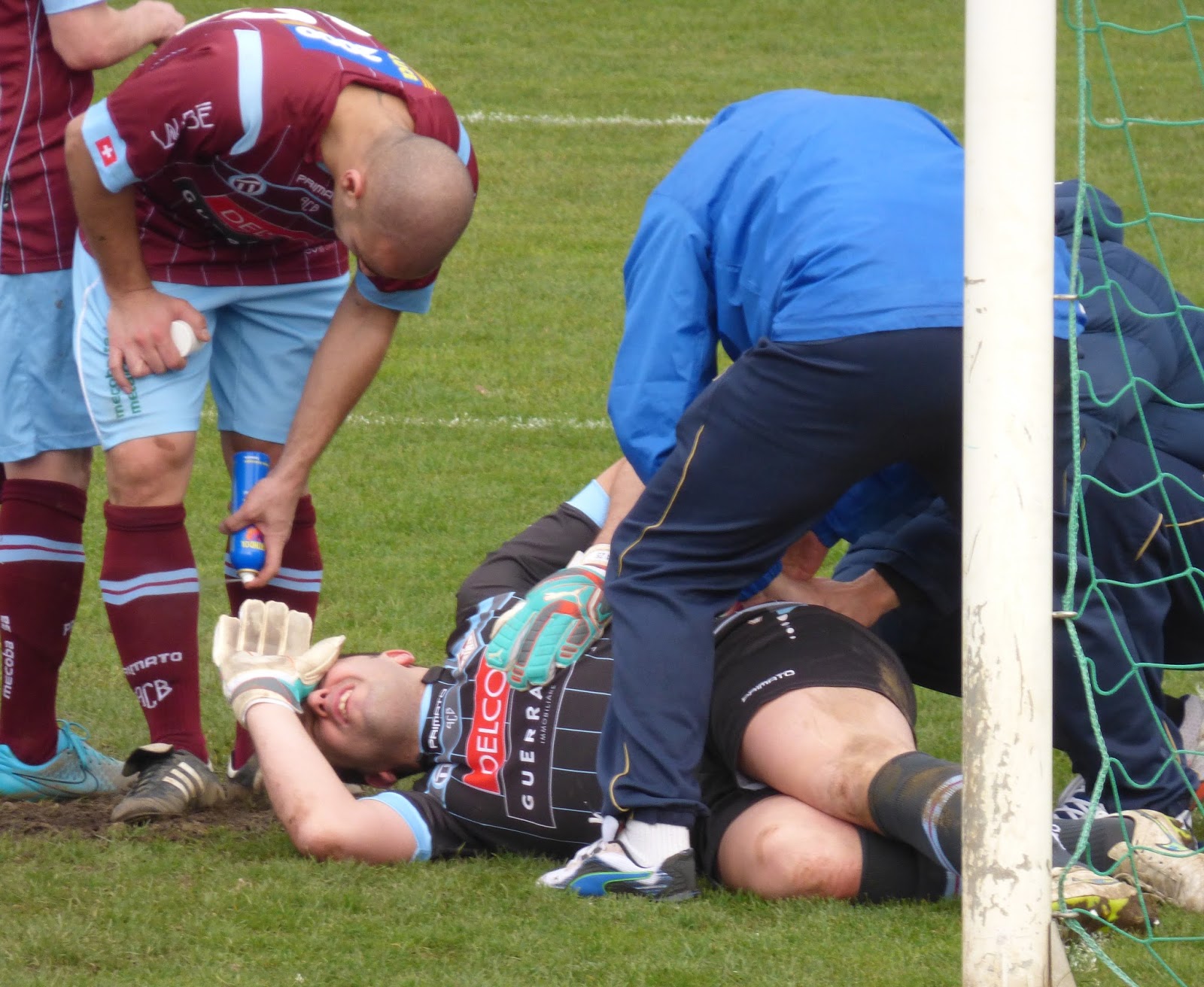 Due brividi al prezzo di uno per il portiere del Bellinzona, Andrea Capelletti nei minuti finali del derby di 2^ Interregionale giocato domenica scorsa a Rancate. In pochi istanti l’estremo difensore granata ha rischiato di incassare la decima rete stagionale (la punizione di Stefano Pasini si è stampata sulla traversa) e di infortunarsi seriamente nel tentativo estremo di evitare quella che avrebbe potuto rivelarsi la rete decisiva dell’incontro. Nelle foto CHalcio.com la sequenza dell’infortunio all’ex portiere del Chiasso. (RCH)